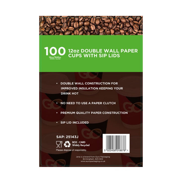 Jena 12oz Double Wall Paper Cup & Lids, Pack of 100
