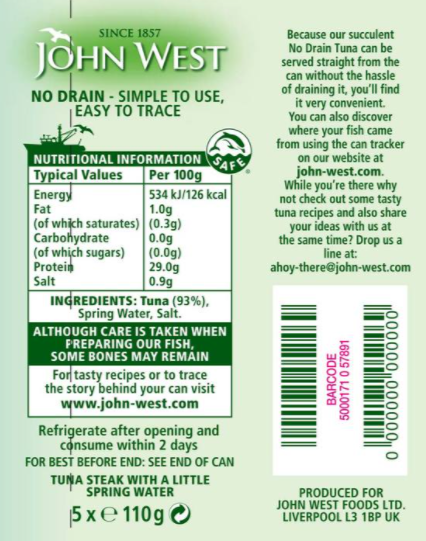 John West No Drain Tuna Steak in Spring Water Pack of 5 x 110g