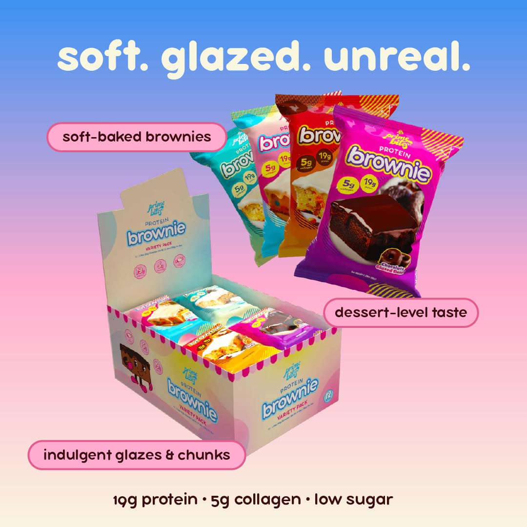 - UNBELIEVABLE FLAVOR ROUNDUP: Prime Bites Protein Brownies come in wonderful-tasting flavors including Banana Nut, Glazed Cinnamon Roll, Glazed Chocolate Donut, Glazed Pumpkin Spice, Peanut Butter Candy Crunch, Cookies & Cream Blondie, Chocolate Cookie Monster, Cookie Dough Bites, Birthday Cake, Blueberry Cobbler, and a convenient variety pack to try more delicious options.