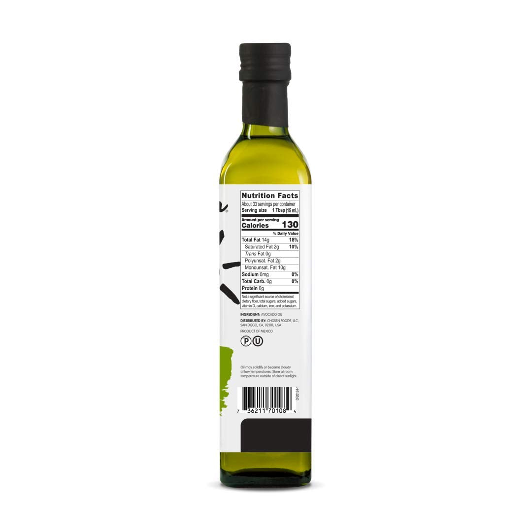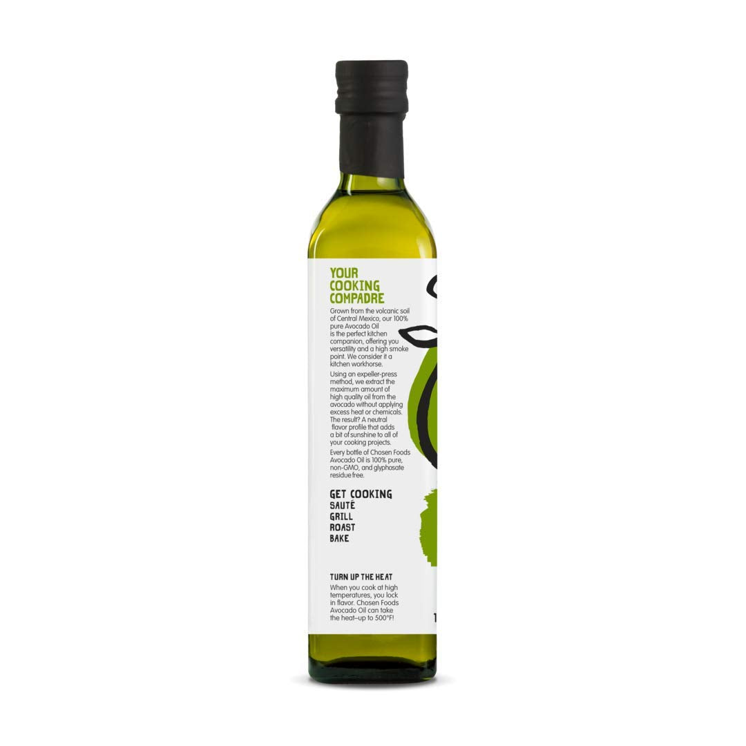 Chosen Foods 100% Avocado Oil is the perfect kitchen companion. offering you versatility and a high smoke point. Using an expeller-press method. we extract the maximum amount of high quality oil from the avocado without applying excess heat or chemicals. This results in a neutral flavour profile that adds a bit of sunshine to all of your cooking projects. Every bottle of Chosen Foods Avocado Oil is 100% pure. healthy. gluten free. soy and canola oil free. plant based. non-GMO and glyphosate residue free.