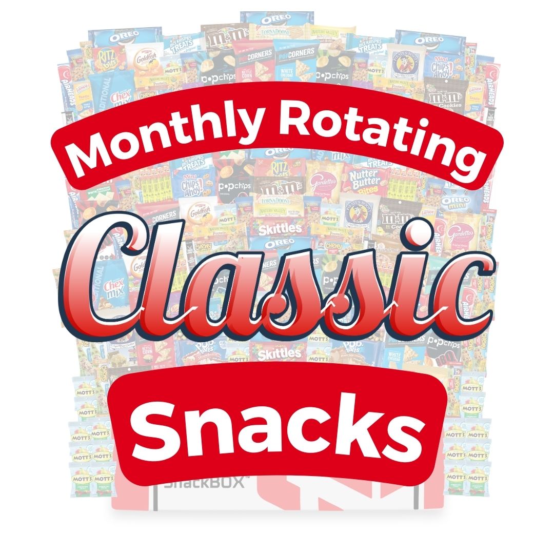 This SnackBOX Contains an assortment of classic brand-name pre-packaged snacks. The assortment will change slightly each month to bring variety to the box as well as keep up with product availability.