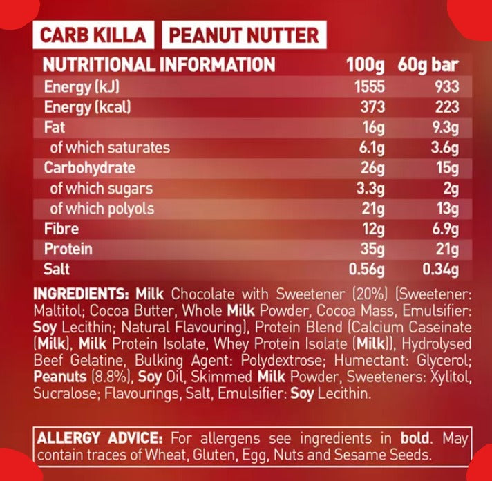Grenade Carb Killa Peanut Nutter is a bit of a nutter! The Carb Killa Peanut Nutter Protein Bar is packed with real peanut chunks on top of a gooey caramel layer and soft peanut butter flavoured nougat. all coated in smooth milk chocolate. With just 2g sugar and 21g protein per bar. you’d be nuts not to switch out your ‘usual’ chocolate bar to this healthier snack!