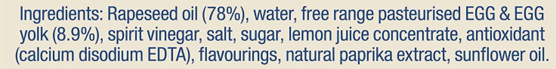 Water. spirit vinegar. modified corn starch. sugar. pasteurised free range EGG & EGG yolk (4%). rapeseed oil. salt. cream powder (contains MILK). citrus fibre. colours (titanium dioxide. carotenes). thickener (xanthan gum). flavourings (contain MILK). preservative (potassium sorbate). lemon juice concentrate. antioxidant (calcium disodium EDTA).