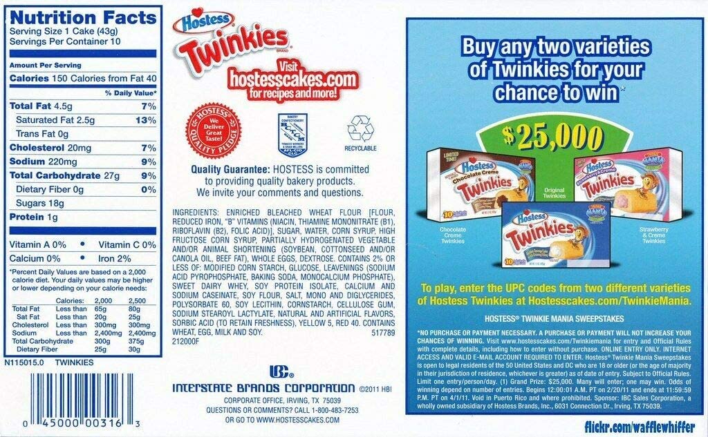 INGREDIENTS Sponge Cake with Vanilla Cream Filling Bleached Wheat Flour. Water. Sugar. Corn Syrup. Glucose-Fructose Syrup. Partially Hydrogenated Vegetable Oil (Soybean. Cottonseed. Canola). Beef Fat. Eggs. Dextrose. Raising Agents (E450. E500. E341). Emulsifiers (Soy Lecithin. E471. E435. E481. E466). Corn Starch. Modified Corn Starch. Glucose. Whey (from Milk). Glycerol. Soybean Oil. Salt. Corn Starch. Natural and Artificial Flavour. Preservative (E200). Stabiliser (E415). Wheat Flour. Colours (E102. E129). Allergy advice: For allergens. including cereals containing gluten. see ingredients above in bold. Warnings: Contains wheat. egg. milk. and soy. E102 and E129 may have an adverse effect on activity and attention in children.