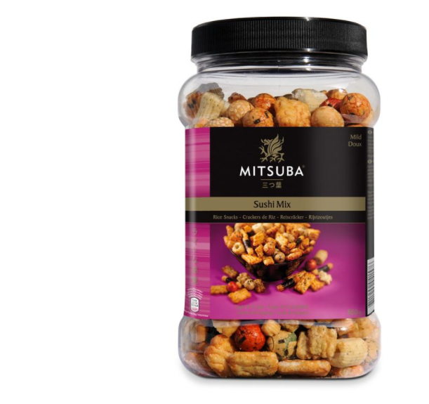 Mitsuba Sushi Mix is acrunchy mix of soy andseaweed flavoured rice snacks andcoated peanuts. A mild Asian flavour with an intense crispness! Perfect to serve as a tasteful bite next to your drinks.