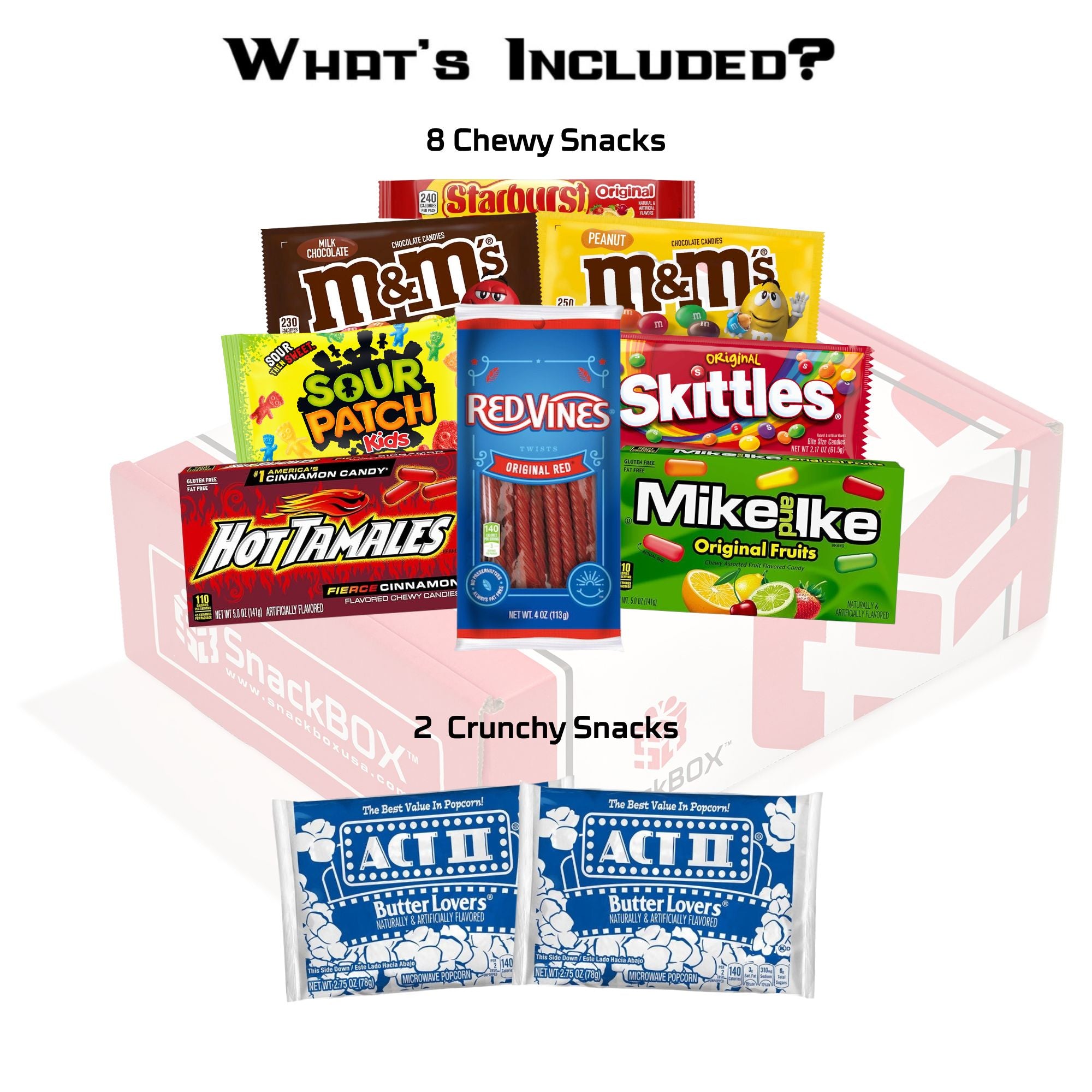 • PERFECT FOR DATE NIGHT: 1 Night DVD Rental Code Gift Card For Redbox. 2 Act II Butter Lovers Popcorn 1 2.7oz Skittles 1 2oz Sour Patch Kids 1 1.69oz M&M’s 1 1.8oz Hot Tamales 1 1.5oz Black Forest Gummy Bears 1 1.53oz Reese’s 1 2.07oz Starburst 1 1.8oz Mike and Ike