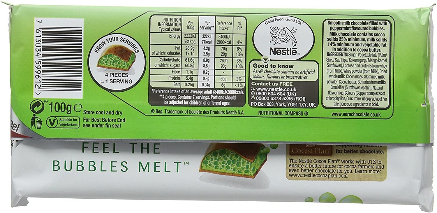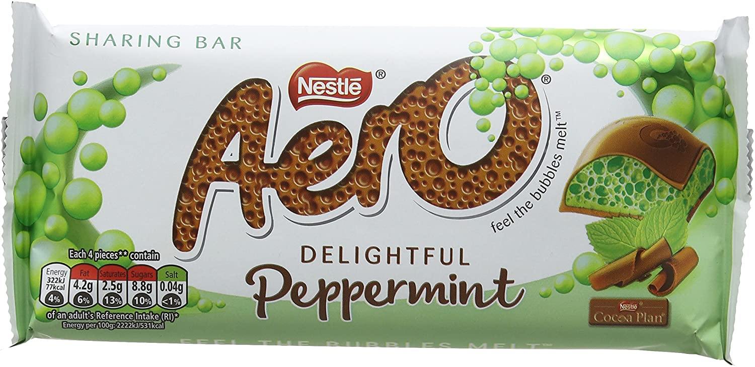 Nestle Aero Bubble Peppermint Chocolate Bars contain a smooth milk chocolate shell and a light. bubbly peppermint centre. Make treat time mintier with our bubbly mint chocolate. ideal for ‘me’ time. when it’s time for a treat at work or in the evening. Break a piece off. feel it melt on your tongue as every single bubble is released. and revel in the bubbly pleasure of Aero chocolate. with no artificial colours. flavours or preservatives.
