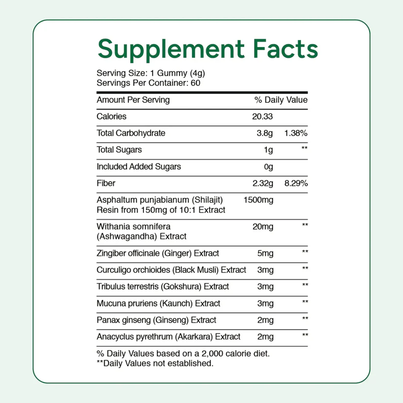 Our gummies contain 1500mg Gold-Grade Himalayan Shilajit (78% Fulvic Acid)AshwagandhaGokshura, and Black Musli — all triple lab-tested for purity. No mystery compounds. No synthetic chemicals. No dangerous stimulants.