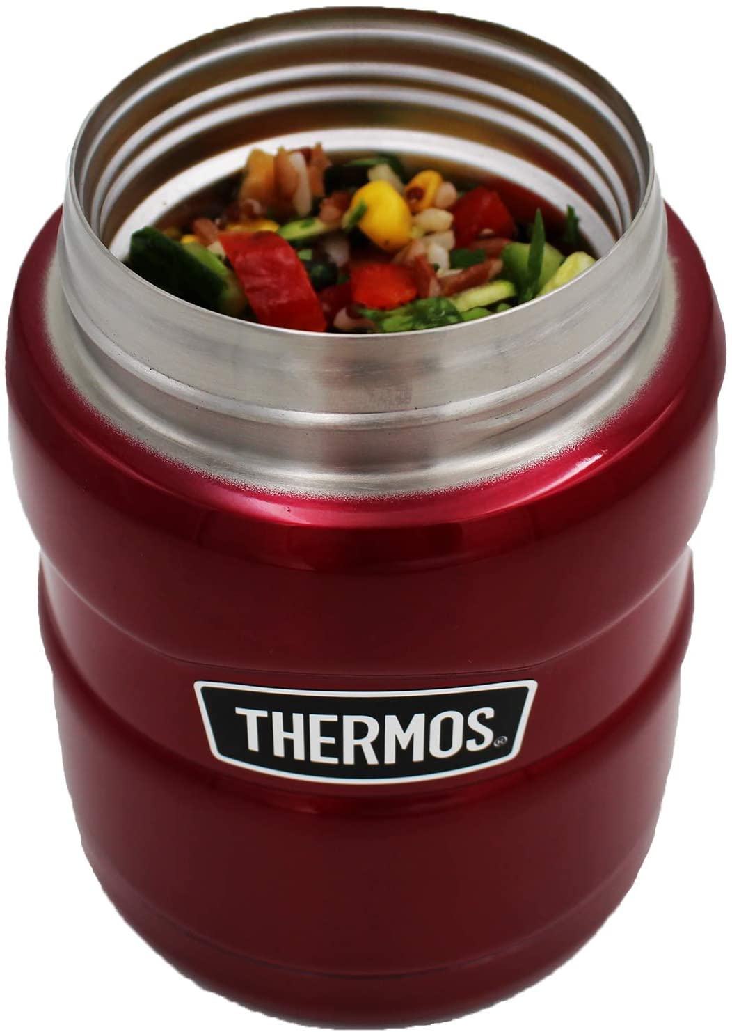 TheThermos Stainless SteelVacuum Insulated Food Flask features a stainless steel interior and exterior making it cool to touch when filled with hotfoodand sweat-proof when filled with coldfood.The stainless king series blends modern technology with a dash of the past. providing reliable products that stand up to the demands of everyday lifemakingthemideal for camping. picnics or simply taking hot food or cold beverages into work. The lid doubles as a serving bowl and conceals a handy full-size folding spoon. meaning you are ready to eat wherever you are. It also has an extra wide mouth which makes it easy to fill. serve from and clean.This flaskfeatures Thermos vacuum insulation technology for maximum temperature retention to keepfoodhot for up to9hoursand cold for up to 14hours.