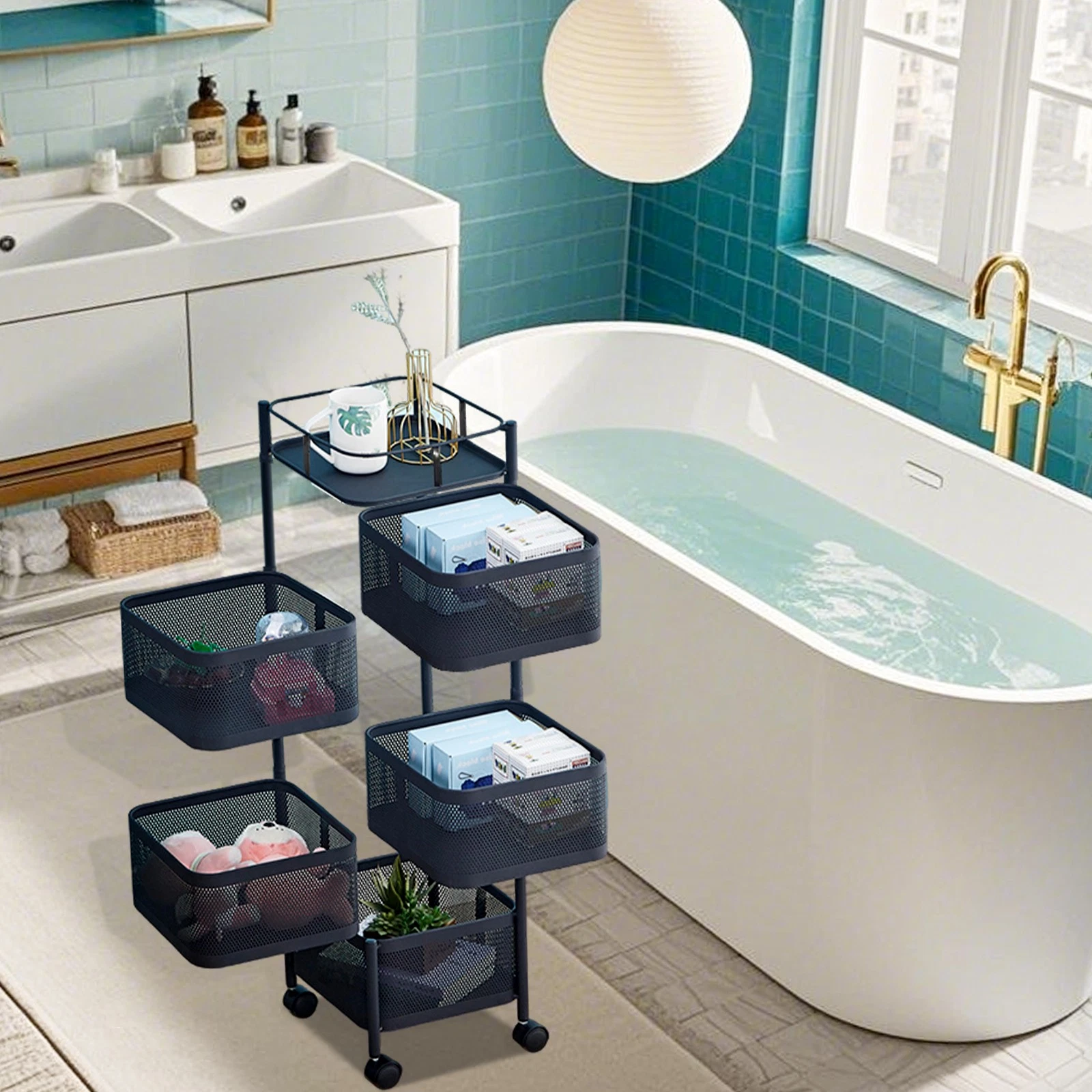 This 5-tier cart is exceptionally useful. I use it in my bathroom to store extra towels, toilet paper, and toiletries. The open design keeps everything aired and accessible. It rolls easily on tile. The metal is coated well and shows no signs of rust in the humid environment. It was simple to put together. A creative and space-saving storage solution for any room in the house